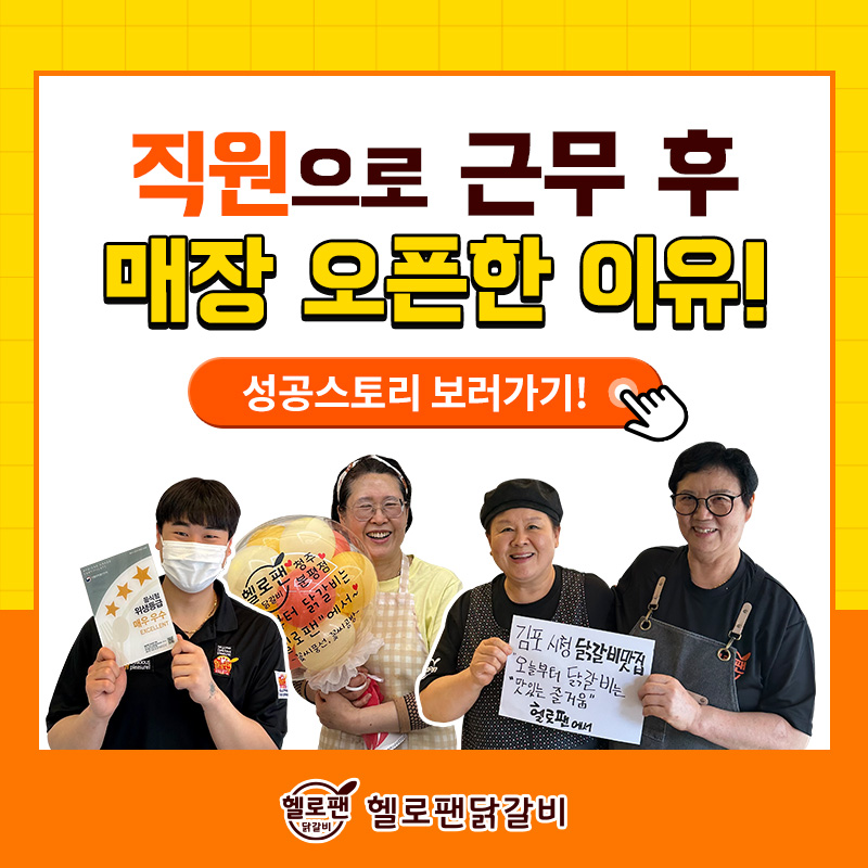 직원으로 근무 후매장 오픈한 이유! 성공스토리 보러가기!헬로팬닭갈비 직영점에서직원으로 근무 후독..